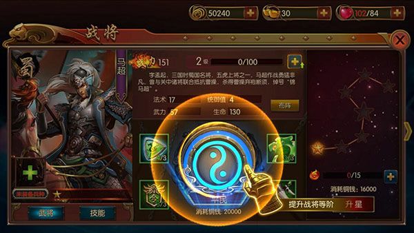 在主界面中点击【武将】选项,进入武将展示界面。点击下图的八卦图形就可以给武将升阶咯!