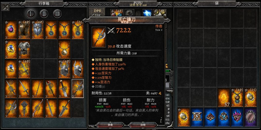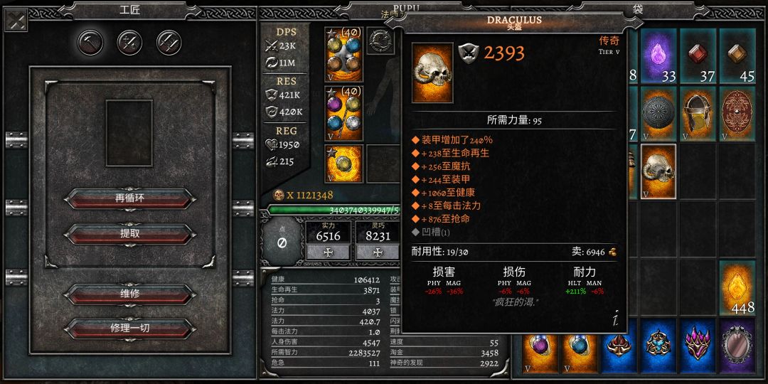 首先黑笼衣服会是的生命再回和生命偷取为负,这很致命,意味着你每秒掉血,且攻击还能把自己偷死!!!所以你需要头骨帽把这两项属性点补回来,如果帽子roll差了没有补全,就用附魔补属性点。