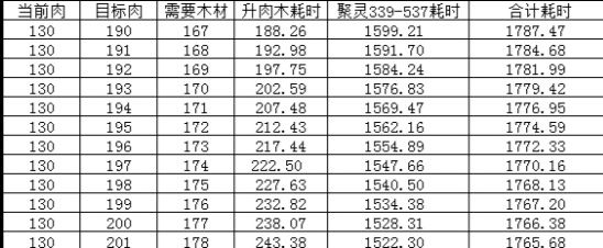 从上图可以看出,合计耗时在190至201时是递减,此时升肉的效率超过了所花费的时间。 大家看我的图,只做到201,为什么呢,因为后面的部分被我截了。如果按照上面的肉木规律推算207肉是拐点后会递增,但因为鬼佬不按规律出牌,201肉升级202需要的木头大幅度增加,需要190的木头,而不是179木,直接跳了11级,时间会增加很多,综合时间就超过201了,所以201肉最快