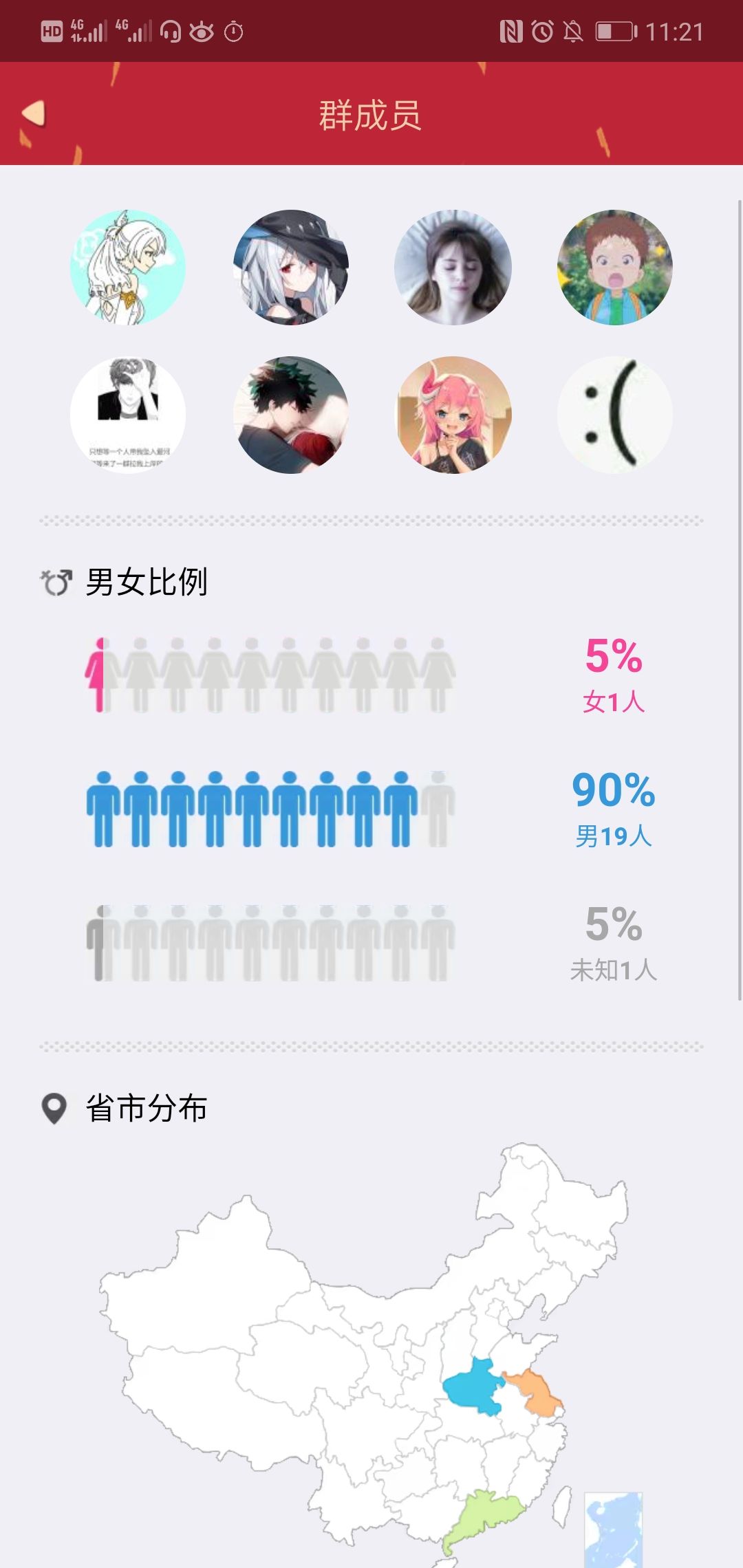 一位大阴阳师,四位大允,六位少允,其他大暑能满足各类开黑需求,群里除了我和妹子不能上单,其他的都能上单。 除了我和浙江,河南小伙,剩下全是广东人。 目前期末车少,在假期车多,不敢说装甲车,起码也是五菱宏光
