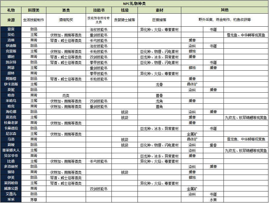 每个NPC都有自己不同的喜好,玩家可以尝试给NPC送不同的礼物,当解锁了日志之后,玩家就可以在日志中查看各个NPC所喜欢的礼物了。最常见的礼物当然是各种精致的料理,部分战斗NPC也会喜欢武器技能相关的书籍,也有喜欢各种矿物、鱼类、甚至是稀有素材的NPC!