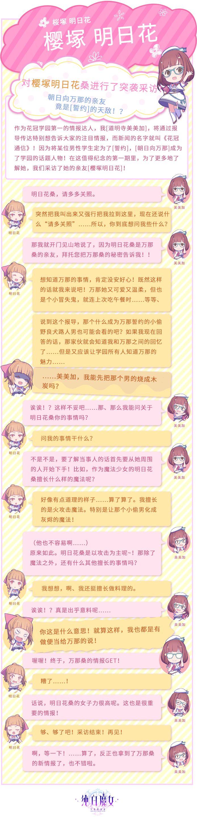 大家好,为了让大家更多的了解纯白魔女中几位魔法少女的故事,我们为大家带来了花冠学园最热门采访栏目《花冠通信》的汉化内容!