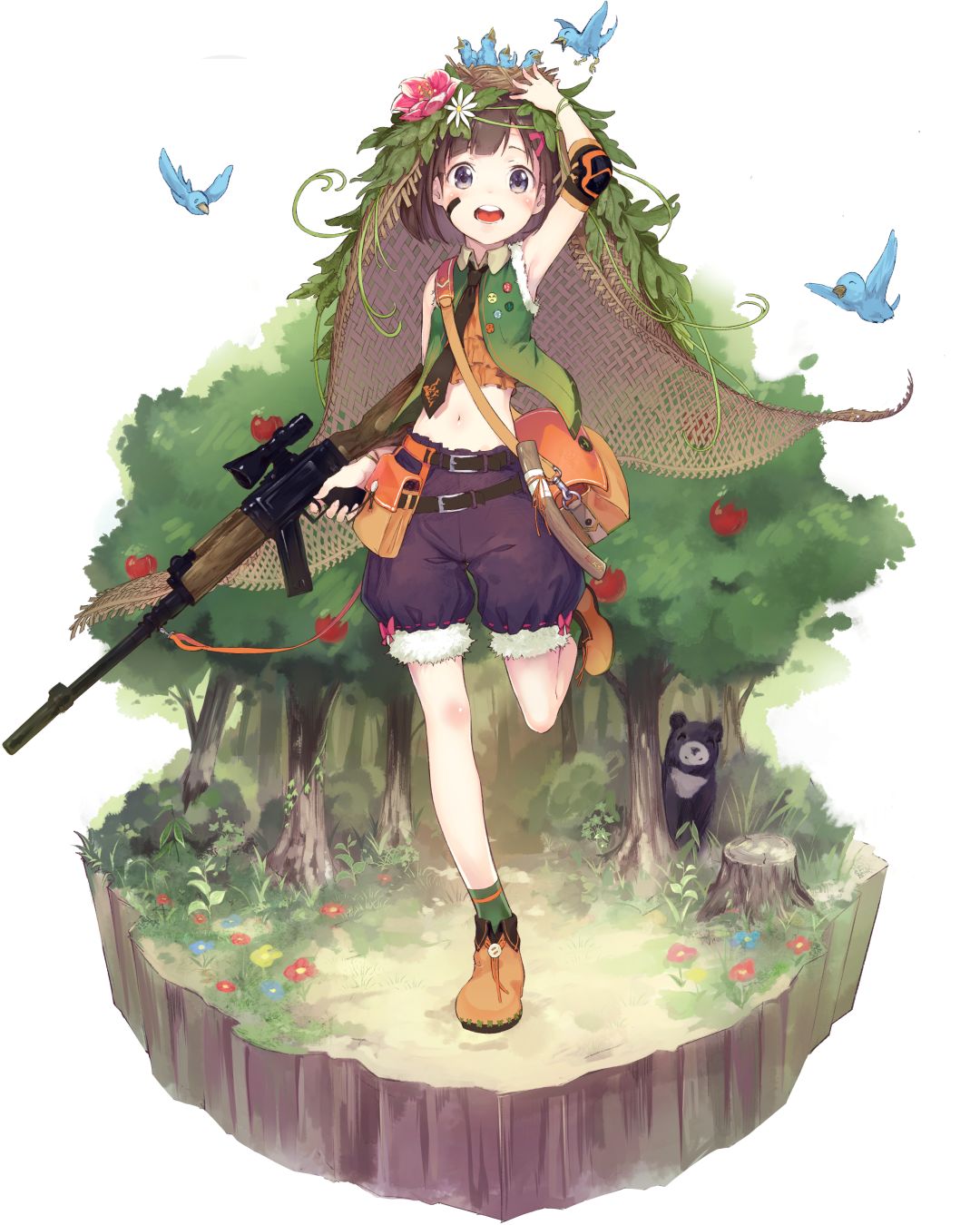 pose:这很简单哦?不过是和山和森林成为朋友哦。山和森林会保护我!(SE:小鸟的叫声)你看,小鸟也是我的朋友,在我的帽子上筑巢了!诶嘿嘿,不错吧?