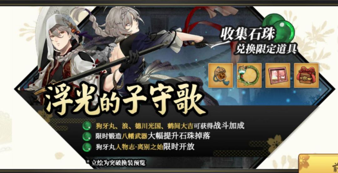 3、在【浮光的子守歌】活动关卡中,狗牙丸和浪造成的伤害增加100%,德川光国和鹤间大吉的伤害增加50%。
