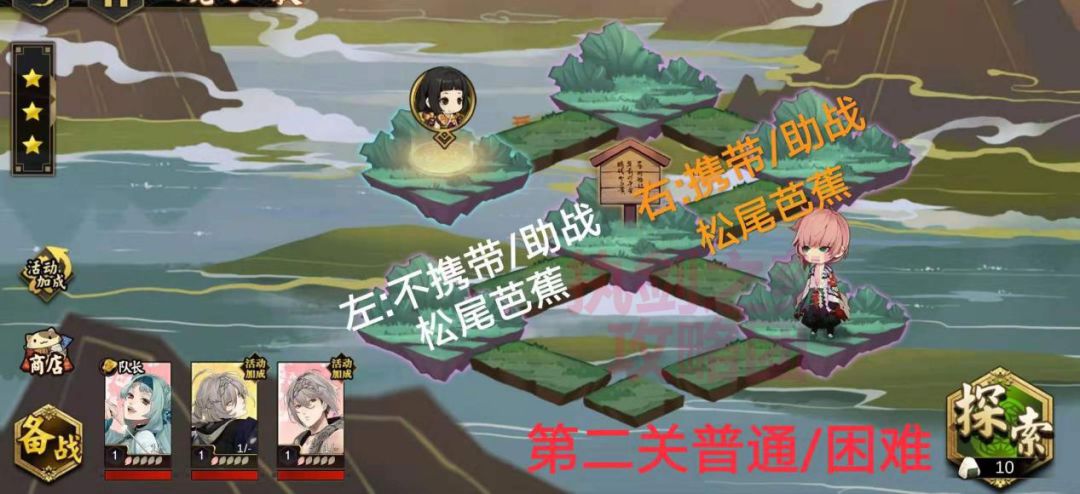 3、关卡中会遇到【陷阱】造成血量损失,小怪只会对前排武士造成伤害,关底BOSS会造成全体伤害,所以建议带奶保证武士不死。阵容推荐:中间路线挂机阵容:远程群体输出(葵、探幽、萌夏等)+狗牙丸+奶(七太夫、天海、珠)。另一套不带奶的鬼族阵容:葵+浪+狗牙丸(注意葵为队长)。练度高的话挂机没问题,练度稍低的话必要时候还是要适时手动。附一个参考挂机阵容数值:43级葵+40级珠+40级狗牙丸。武器均为攻击属性强15,主要依靠葵输出。武器属性也还好,好的武器建议强化15。