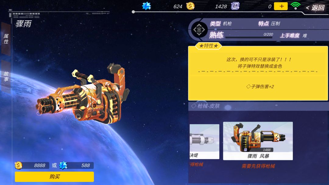 骤雨:重机枪骤雨散射范围较大,命中率普通,但每秒子弹的高速倾泻仍能打出巨额伤害,压制住范围内的敌人,在战斗空间狭小如排位中的占点图能发挥出巨大优势。点击开火按钮一秒后才会射出子弹。