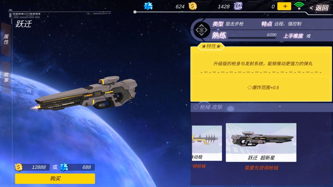 跃迁:跃迁是一把电磁狙,蓄力时间比文渊更长,命中敌人或到达最远距离时造成范围伤害和麻痹控制效果,使敌人动弹不得。跃迁在最远端时命中比文渊容易许多,因此跃迁常用来反敌方文渊狙击,也称为反狙。对局时亦可拿出两到三把跃迁让对方动弹不得。