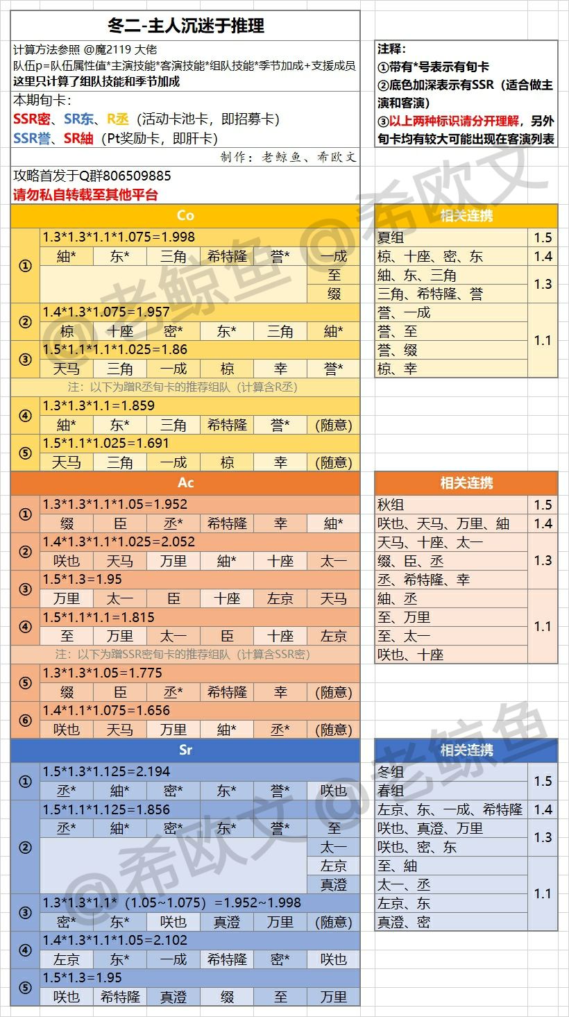 跟新来的姐妹介绍一下,我们的攻略是根据每次活动的旬卡和连携技能表(具体内容在攻略区往前翻一翻可以找到)做的。以往的队伍排序比较乱,这次的是以可以放入的旬卡张数为第一优先,其次才是整体倍率的高低,因为旬卡的加成对分数提升更大。