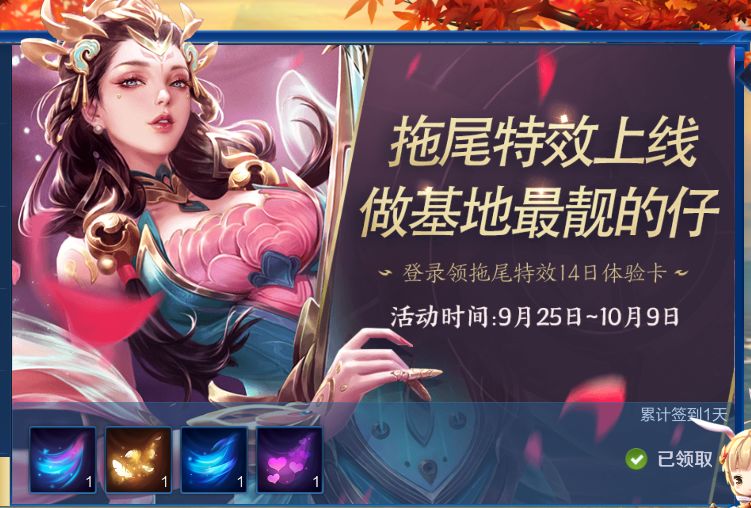 活动内容:上线即可前往【活动】页面领取五种拖尾特效的14天体验卡:名列前茅、王者拖尾、蓝色心情、粉色爱心 和 彩色泡泡。
