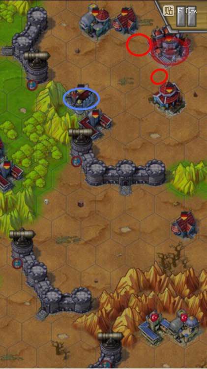 第二阶段。攻击右上红圈,图中两个红圈处有一弓一炮。推荐先手debuff 控制,或者上一个炮灰占领住蓝圈兵营抗伤害。另外,注意把工厂拿下。