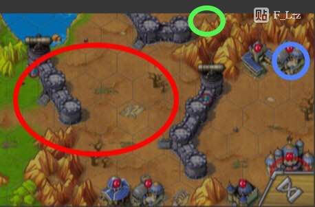 第三阶段。注意右上红圈处,解决了两个无名之后就向下走。用工厂爆火炮解决红圈。图中红圈处有大量无名将,索性他们反应迟钝,这里计算细致一些,炮将站住绿圈位置,攻击城门同时靠反伤攻击塔。所有部队迅速进入内堡,炮将攻击红圈堡垒,其他将攻击凯末尔。