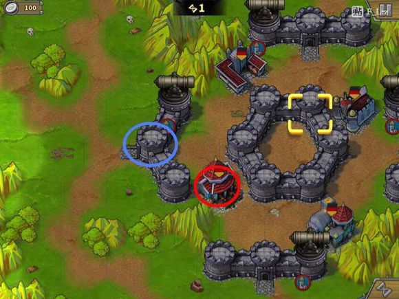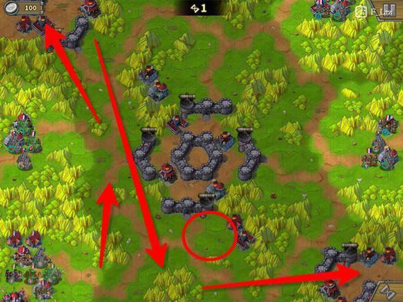 大概思路就是这样。图中的红圈处有一弓一炮,附近不明火力比较足,大家先不要碰那里。