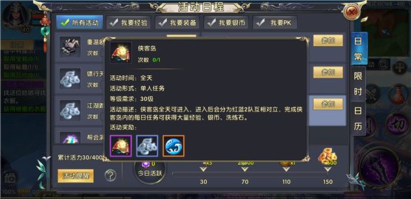 首先简单就侠客岛任务介绍一下,本活动为日常活动,玩家可以在全天任意时间参与进来。活动形式为单人任务,参与等级限制为至少30级,玩家想要参与的话得赶紧升级哦。活动规则为玩家进入后会分为红蓝两队对立,双方互相厮杀到达一定人数即可完成活动,进而获得大量经验、银币和稀有材料洗炼石,可以洗练装备词条属性哦。