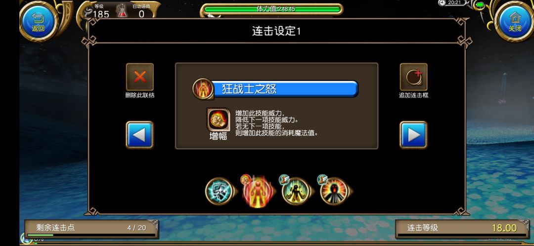 同上,战吼省下300蓝,狂战本来是500蓝耗,但我们上了“连击”效果,狂战蓝耗减100,那么此技能的蓝耗就是:步步的100+狂战消耗掉战吼还多出的100蓝。由此可见同一个连击,只要你稍微深究一下就能省点蓝(那为什么不定制一套最适合自己的呢)。