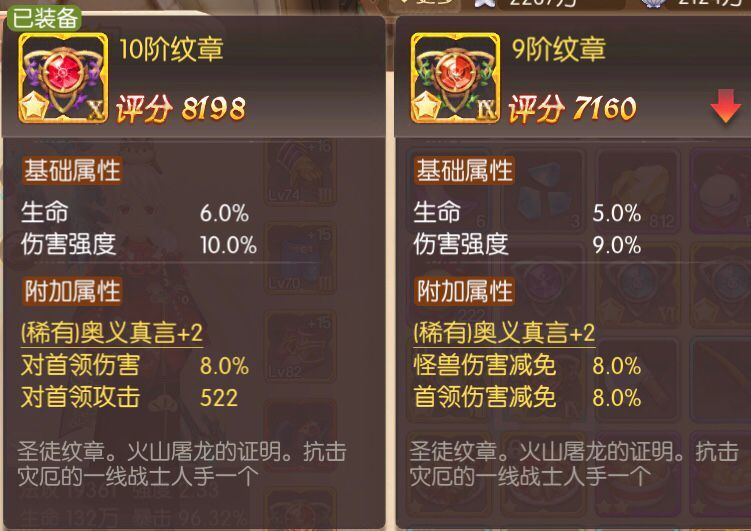每一个小伙伴都会有有自己的纹章偏好,『再见祝君安好』小伙伴通过灵活佩戴纹章,给自己争取极限输出的机会:即前面用对怪物伤害和怪兽伤害减免属性 ,后面到了BOSS的时候使用对首领伤害和首领免伤属性的纹章。
