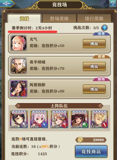 如上即是竞技场页面,圈上的是简单、普通、困难三种难度的敌人。简单一般玩家都可以挂机打,普通稍微费一些事,困难对于一些玩家甚至手动都很难战胜,赢了也很容易有战损、降低竞技积分。