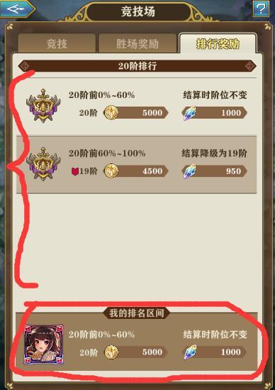 左下显示连胜多少场可以晋级,当前连胜(连胜加30%竞技积分),以及当前竞技积分。这些到了20阶后就可以无视了,萌新期才需要注意。连胜晋级自不必提,竞技积分只需要让自己在当前阶位排在第一档即可,多了没有任何作用。处在哪个阶位、档位以及相应奖励可以点击竞技场页面右上的 排行奖励分页面,点开后如下图所示。