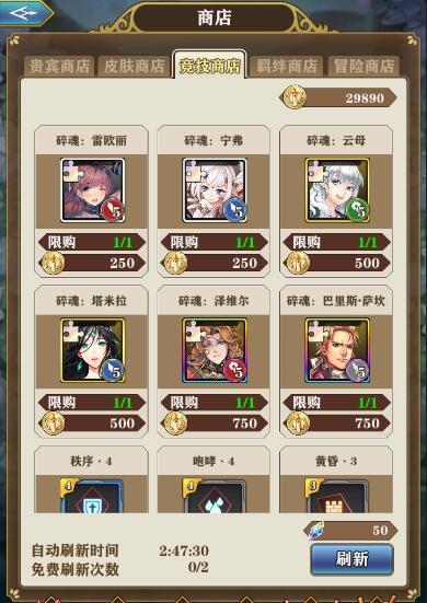 竞技商店是唯一需要竞技币的敌方。萌新注意,最下边的印记就是坑,永远都不要去换(当前价格,绿——1000,蓝——2500。以后若能降价就不一定了)。所以竞技商店就是兑换角色碎片,这也是打竞技场除了获得钻石外的另一个主要目的。