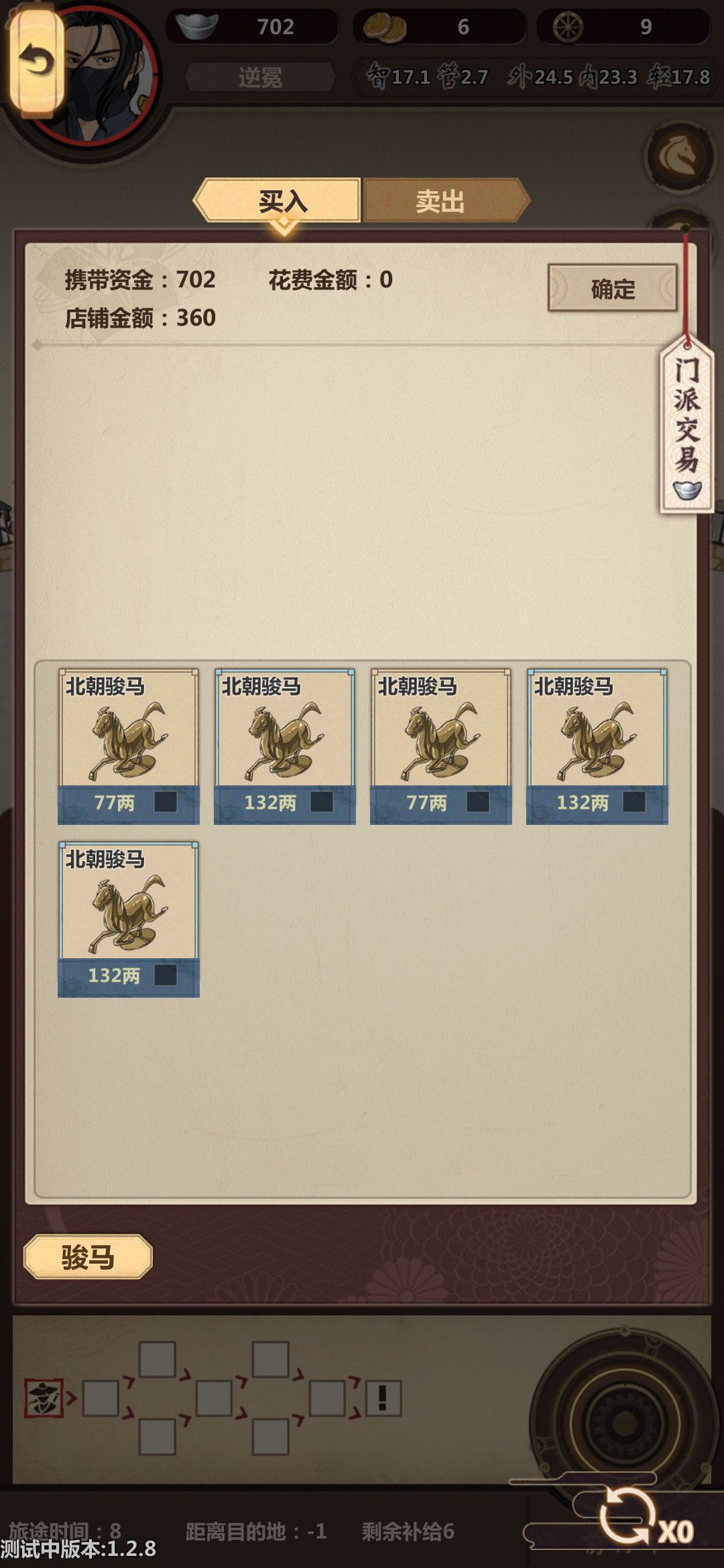 这次行侠结束后我们先去黑市买马!(这次不要全买下来,买你可以携带的最多马!因为这远行次结束后南北通商就没有了!买多了的话就砸在手里了!)