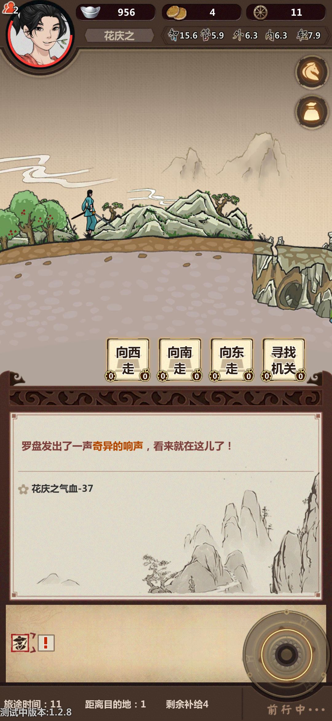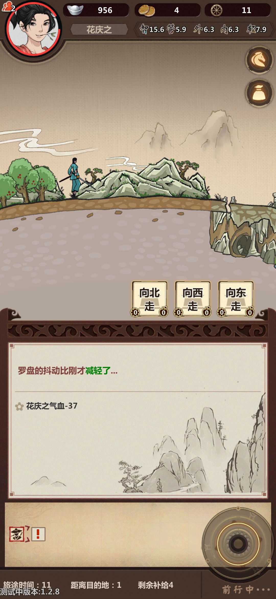 ——————————————————————————我们开始玩小游戏!就是一个上下左右我们先随便走一步试一下!↓↓↓我走的是东我们发现罗盘的震动变轻了!说明我们走错了!我们换个方向在走一下试试!