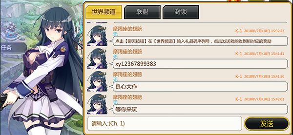 用户登录游戏,点击【聊天按钮】在【世界频道】输入礼品码序列号,点击发送就能收到相对应的奖励。