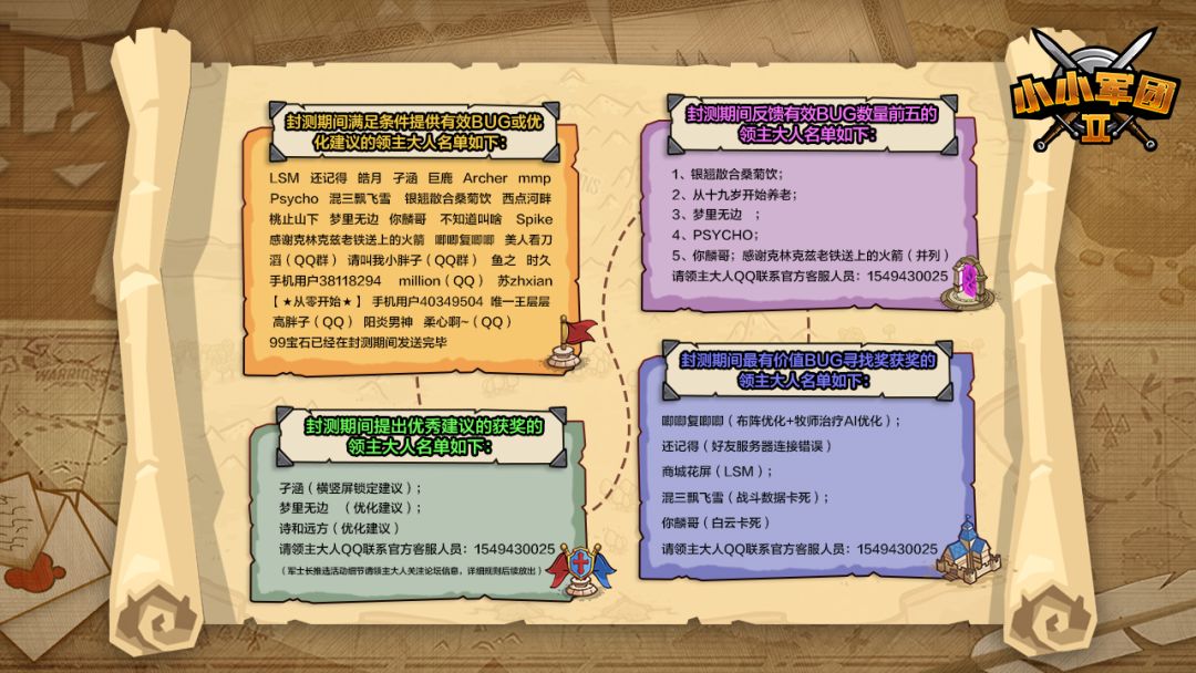 此次删档封测顺利收官,感谢以下参与BUG反馈的所有领主大人,此次封测期间参与活动并获得奖励的大人如下,封测期间的奖励已经全部发放,后续正式服奖励请领主大人QQ联系官方客服人员备注TapID,我们将在公测上线后为领主大人们发放奖励,官方客服人员QQ:1549430025