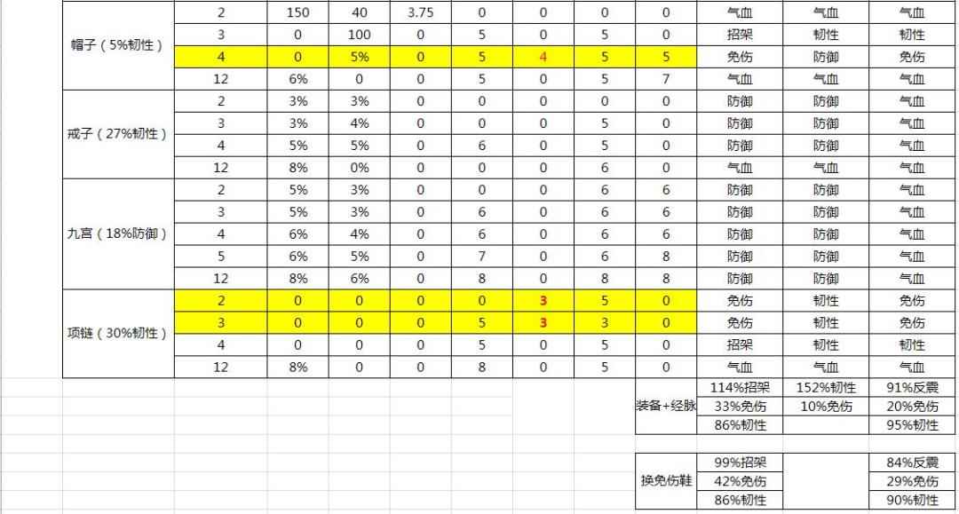 很多人看不懂就补一下内容,表格为参考。下面装备+经脉裸属性(保留性价比极高的属性后的情况)