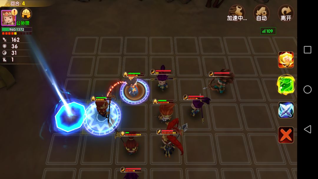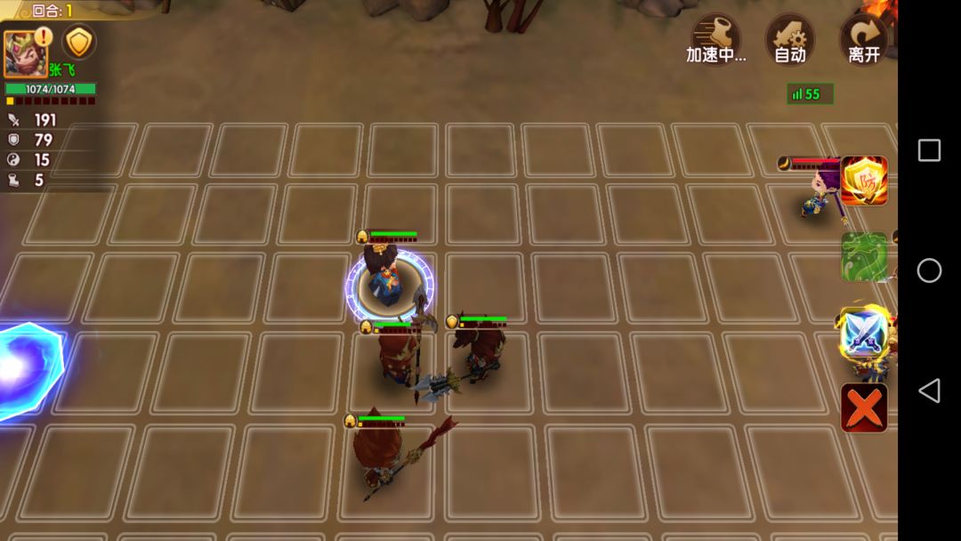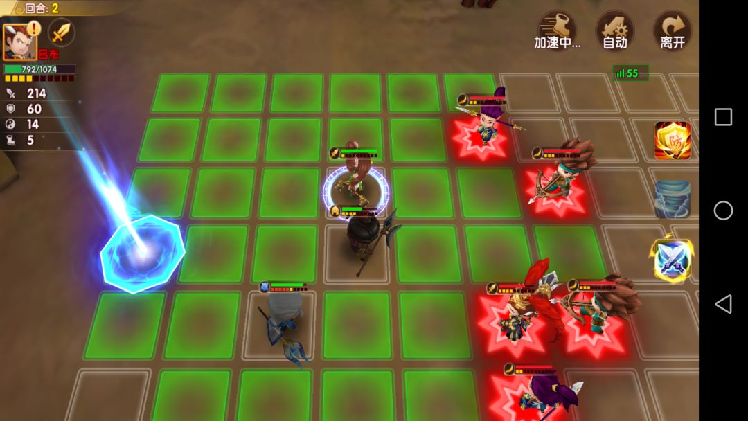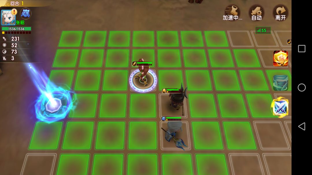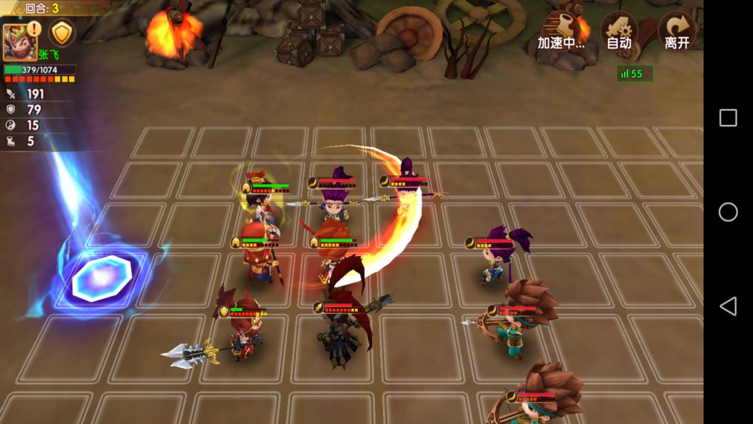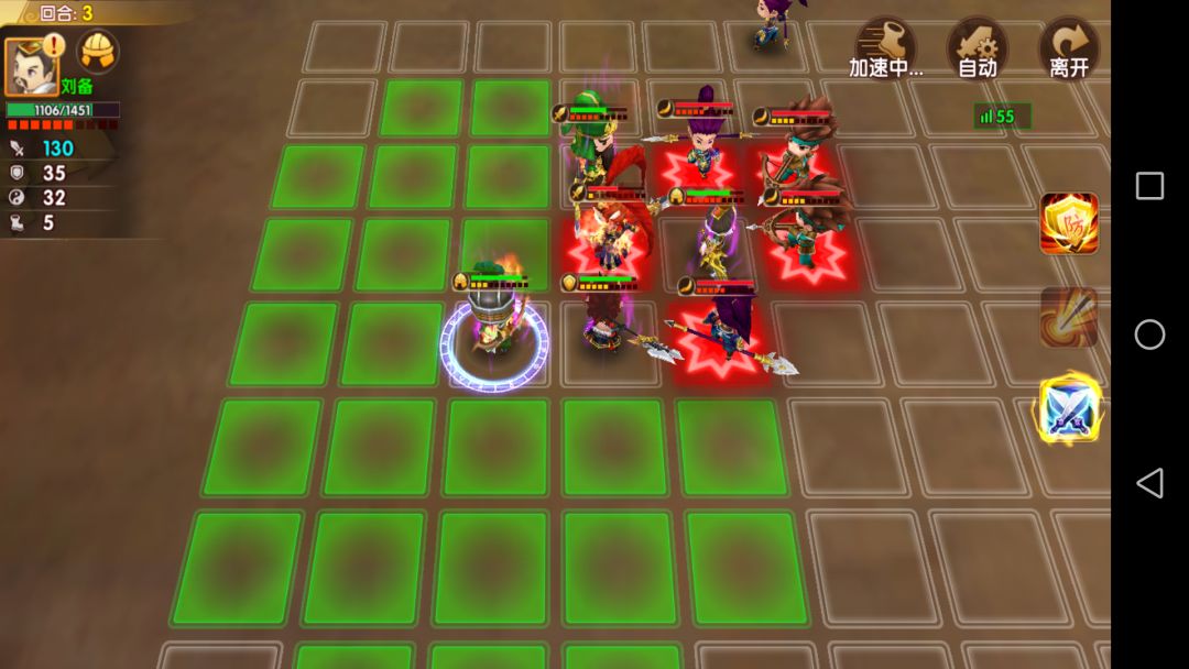 基本不用主动攻击,除了张昭需要打下补气,第一回合站位一定不能三将并排,张昭和武安国站一起,另一个在后一个就可以。