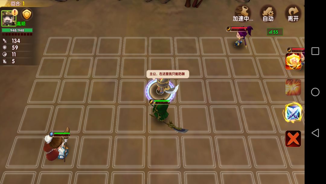 一回合站位张飞可以站前面,第二回合忘了截图不过不影响,都是后退一格,张飞可以和另一个武将换下站位,第三回合依旧后退不要攻击,第四回合公孙瓒行动后阿斗放权