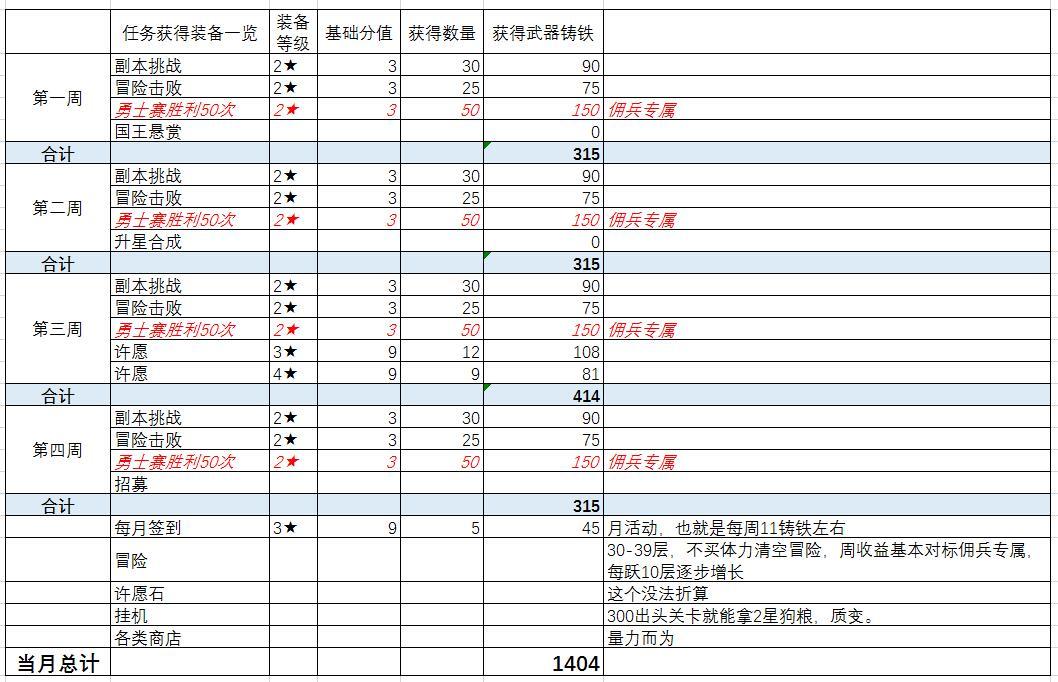 总结:挂机、冒险收入这个相当难折算,打个比方,我现在90级240万战斗力,月卡三卡开齐全,假设无任何补偿,所有周任务做齐全,基本能做到1周800-1000铸铁,也就是3件6★装备左右,这个随着挂机推图的深入,冒险的层数提升,获得武器铸铁的速度不断加快。