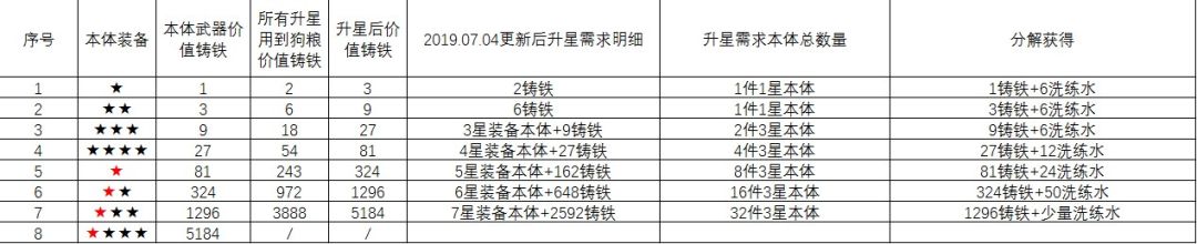 所有装备的升星和分解价值完全对标之前的版本,依旧是需要大量的本体,兄嘚们看图吧