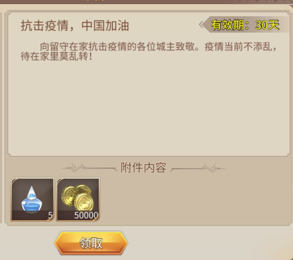 2、活动期间(从1月30日开始),每日登陆会收到 “中国加油礼包” 内涵 5个小体力、5W金币
