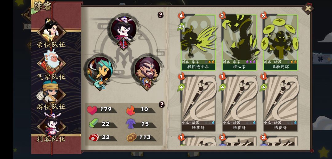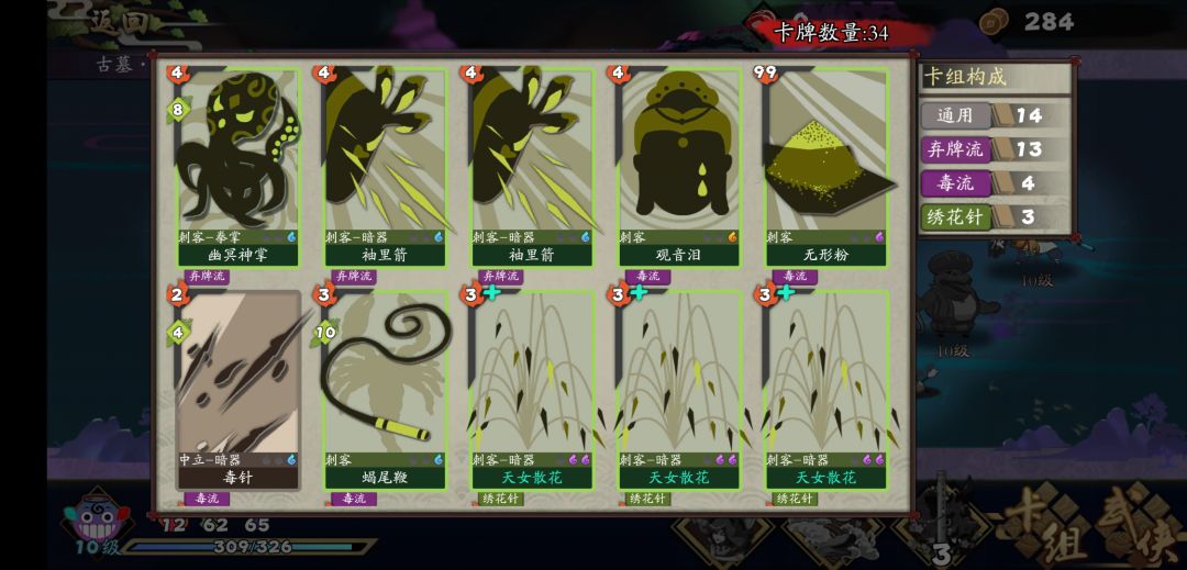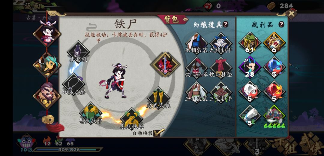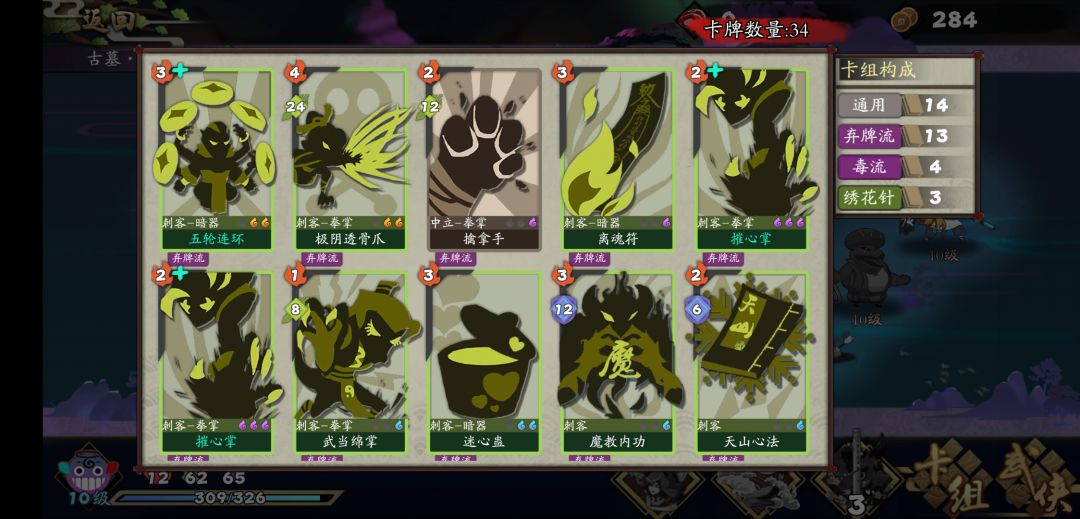 关于装备和打法,在尝试了一下后,基本可以肯定,只能玩连弩绣花针跟怪耗,所以敲定最终模板为:以忠武+饮血为底,尽量拿到无情和道士傀儡增加输出能力,稍微多拿2张暴雨梨花和天女散花,保证上手率,有摧心掌和无形粉无脑拿。当然想的很美好,现实骨感的一比,要啥啥没有,无情套和连弩是5层快到boss才拿齐,最终boss是金轮就活了两轮就被毒死了。在此之前,绝大多数怪都没有额外的攻击力,适当的叠下盾被掉太多血,饮血会吸上来的,甚至我都是不买食物裸奔的,有夺魂后起手选择性弃牌叠盾+过牌,全程没有特别硬的骨头,不过1层在我选了4防御的情况下,还是在1-2层买了几次血,觉得难打就sl用铜尸技能叠下毒,特别在有忠武和天女后,唯一的拔钉子技能。