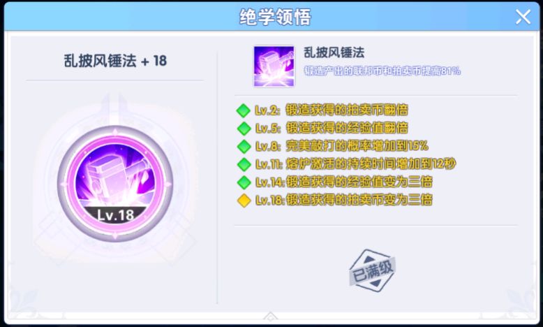 2.提升绝学系统中的“乱披风锤法”等级。功法等级越高,“打铁”时获得的经验值越高,升级当然就更快了。另外还能提升“完美敲打”的概率,让我们在“打铁”过程中获得更多的金币!