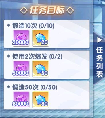 每天都会有3个锻造任务,这三个日常任务一定要完成,会送钻石!当然,最后一个任务通常是锻造时开火的次数或者是进行50次锻造,这个对一部分同学就有点难度了,因为不管是开火次数还是锻造次数都跟锻造矿石的数量有关系。