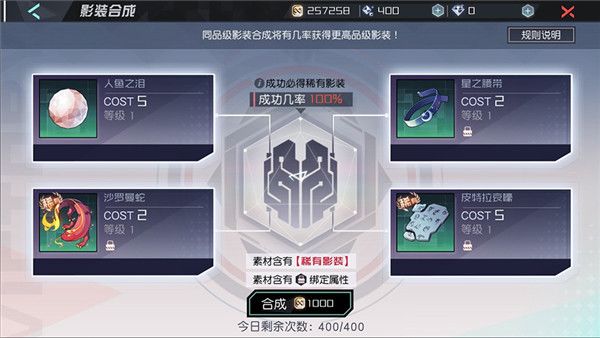 另一方面,影装拥有强度,即品级上的差异。但初始品级≠最终品级,低品级的影装可以通过合成的方式进行提升 。不过这种提升需要“舍弃”的勇气,将同品级的四件影装放入合成,合成成功后可提升其中随机的一件品级,其余三件将被无情消耗。想要变得更强,可没有那么容易哟。