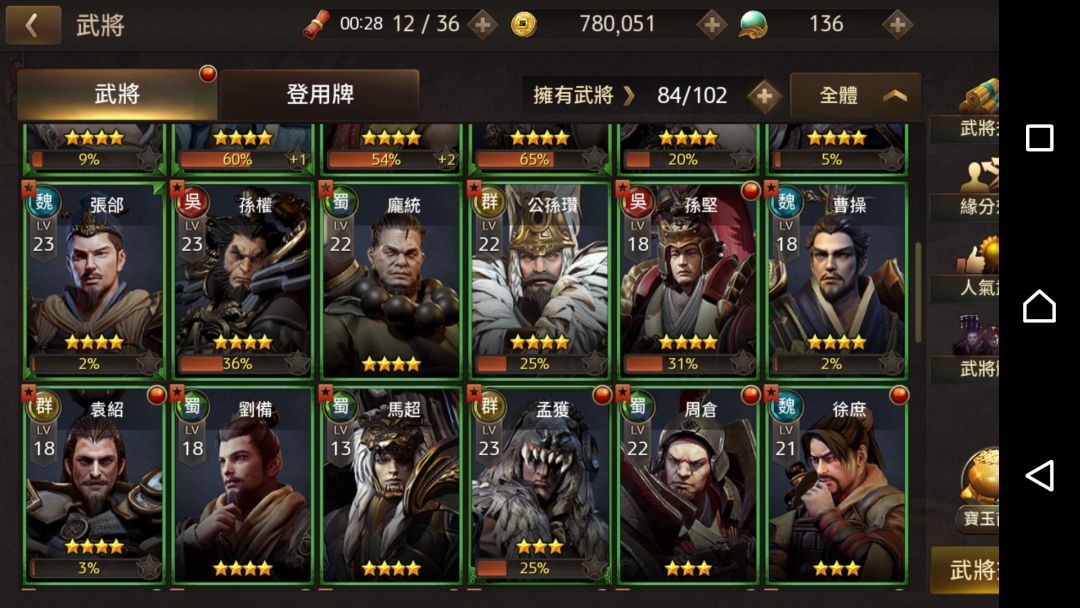 猛将如云,蜀国五虎将除了赵云没有,今天刚抽的马超,老黄超能打,魏国夏侯惇必须要有,吴国智谋最厉害的周瑜和陆逊也拿了,还有智商最高的诸葛亮,庞统,司马懿也加入我的智囊团。三国的美女们大部分都纳入到后宫来伺候朕了,可惜吕布的女儿没能抓到😂