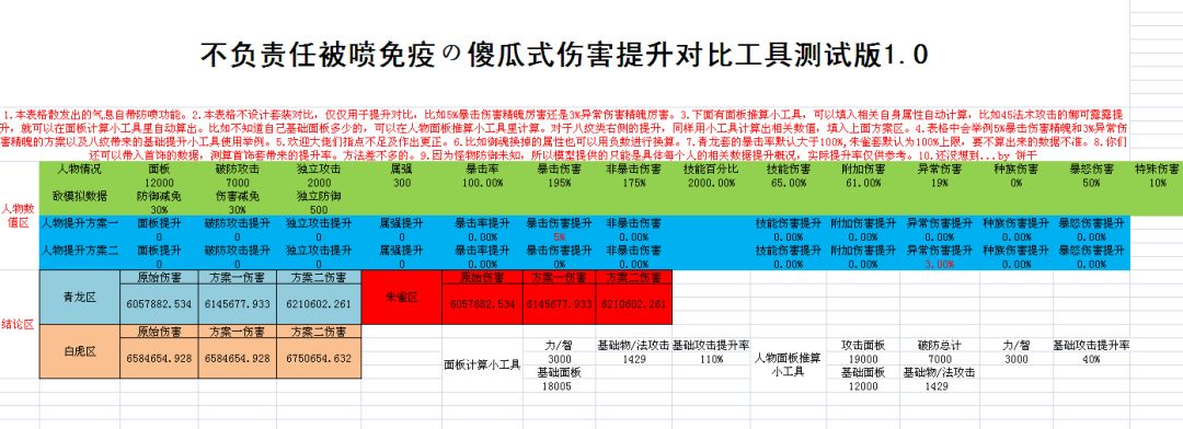 补充几句,面板是基础面板,人物显示的减去破防攻击的。破防攻击的面板记得乘时装的5%哦。表格没有涉及到套装的区分,最终结果那里是因为三套防具收益计算方法不一样所以我拆分开的,比如青龙的暴击伤害和白虎的非暴击伤害是两个公式得出的。大家代入自己人物面板打开的数据填入,然后看对应自己套装区域的结果就可以了。