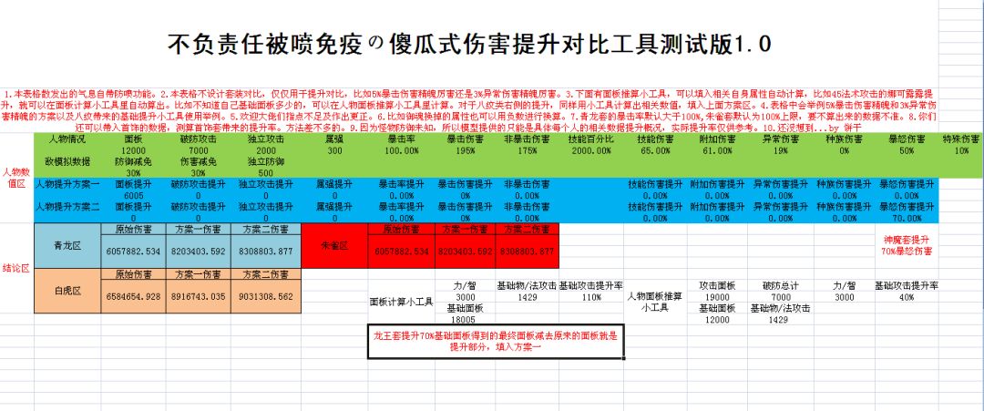 最后说下注意事项,表格里也有标红说明,大家先看看,以免和BUG魂一样出现BUG。1.本表格散发出的气息自带防喷功能。2.本表格不设计套装对比,仅仅用于提升对比,比如5%暴击伤害精魄厉害还是3%异常伤害精魄厉害。3.下面有面板推算小工具,可以填入相关自身属性自动计算,比如45法术攻击的娜可露露提升,就可以在面板计算小工具里自动算出。比如不知道自己基础面板多少的,可以在人物面板推算小工具里计算。对于八纹类右侧的提升,同样用小工具计算出相关数值,填入上面方案区。4.表格中会举例5%暴击伤害精魄和3%异常伤害精魄的方案以及八纹带来的基础提升小工具使用举例。5.欢迎大佬们指点不足及作出更正。6.比如御魂换掉的属性也可以用负数进行换算。7.青龙套的暴击率默认大于100%,朱雀套默认为100%上限,要不算出来的数据不准。8.你们还可以带入首饰的数据,测算首饰套带来的提升率。方法差不多的。9.因为怪物防御未知,所以模型提供的只能是具体每个人的相关数据提升概况,实际提升率仅供参考。10.还没想到...by 饼干