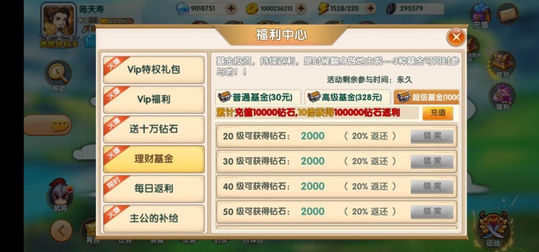 理财基金类似于其他游戏的等级基金,同样是购买基金之后到达一定的等级可以领取一些游戏内的货币。相比于其他游戏的等级基金运筹三国的理财基金可以算的上是诚意满满了。因为他的基金是可以叠加的。比如你买了1000的超级基金那么你不但可以拿到普通基金(3000钻石返利),而且还能拿到高级基金大于32800钻石的返利,以及100000钻石的超级返利,简直不要太良心。