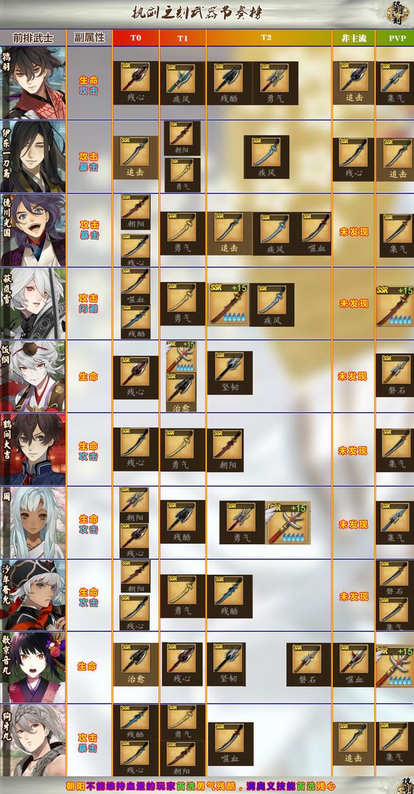 1.武器节奏榜优先级以武士无辅助出战时的强度优先(也就是不算酒井和音丸的暴击爆伤buff),故本榜中追击剑质对于自身暴击不高的武士排名会偏后。