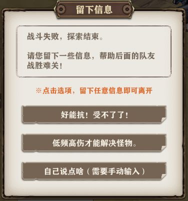 本次活动冒险中,敌人的特性是不可见的!团长大人可以根据其他团长大人留下的留言以及部分NPC的话来选择合适的对策。