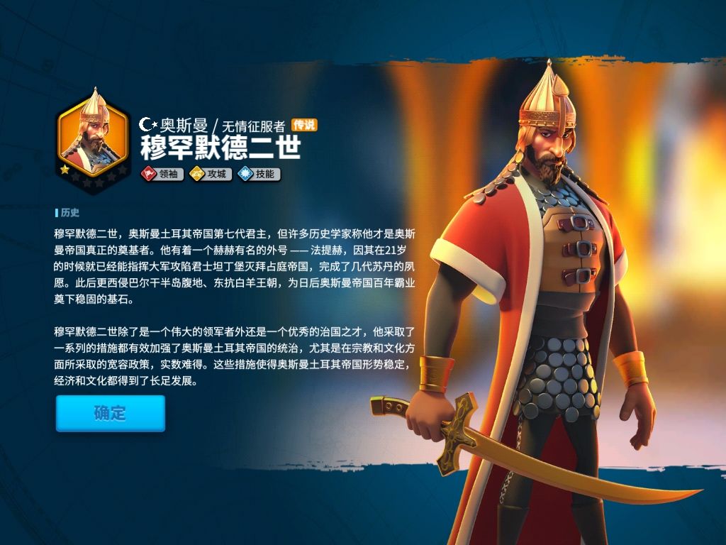 好了,不该说的部分乐都说了,该水的都水完了,那么现在整篇开始--今天的乐我呢,要为大家带来的是橙将大家庭的全新橙将,潜力颠覆凯撒和汉尼拔攻城霸主地位的他,土耳其奥斯曼帝国的第七代苏丹、弑亲者、征服者,奥斯曼帝国真正奠基者:穆罕默德二世,新一代攻城霸主之位最有潜力的竞争者