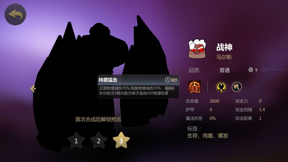 首先战神是没有攻击力的,虽然他有攻击间隔,但是就算你给他攻击力的装备他也无法进行攻击,然后战神的技能可以说是超强前排,没有之一,3星之后正面物理减伤75%,侧面物理减伤35%,并且每隔8秒对前方3格的棋子造成450的物理伤害