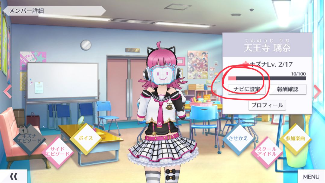 有小伙伴不知道如何替换看板娘,这里说一下:点home右侧的【エピソード】,找到你想要的一只,然后点下面红色圆圈的按钮即可