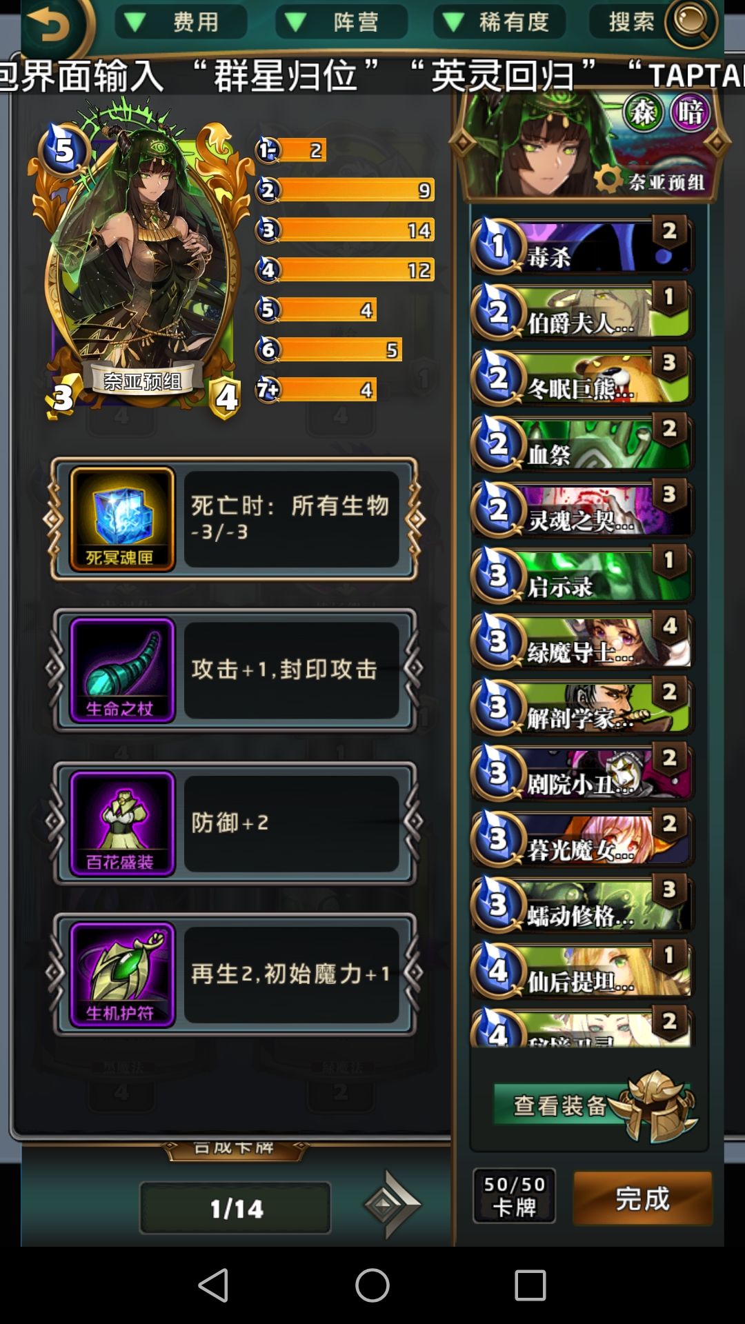 这套虽然还没有成型,但是可以说已经是初步可以玩的地步了,奈亚本身的职业特色就是利用墓地和毒,我这人不太喜欢毒,所以放弃了很大一块剧毒的部分,用过牌和回血来代替了一下,简单来说就是利用掘墓和灵魂之契尝试大量的从墓地拿过来高质量的怪物,最后在用犹格复活出来,由于还不是很完善我也不太能说出这套卡组的特色在哪里(毕竟我连卡组名字都没改吗),本体带匣子能有效的压制狐狸这种靠场面的快攻,也可以在我方压力大的时候排出去减轻一下压力,