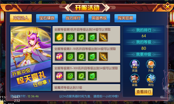 【活动内容】从开服第一天开始,每天开放不同的排行榜,冲击各大排行榜可获得大量稀有道具,排行前十名玩家更可获得极品神装!!