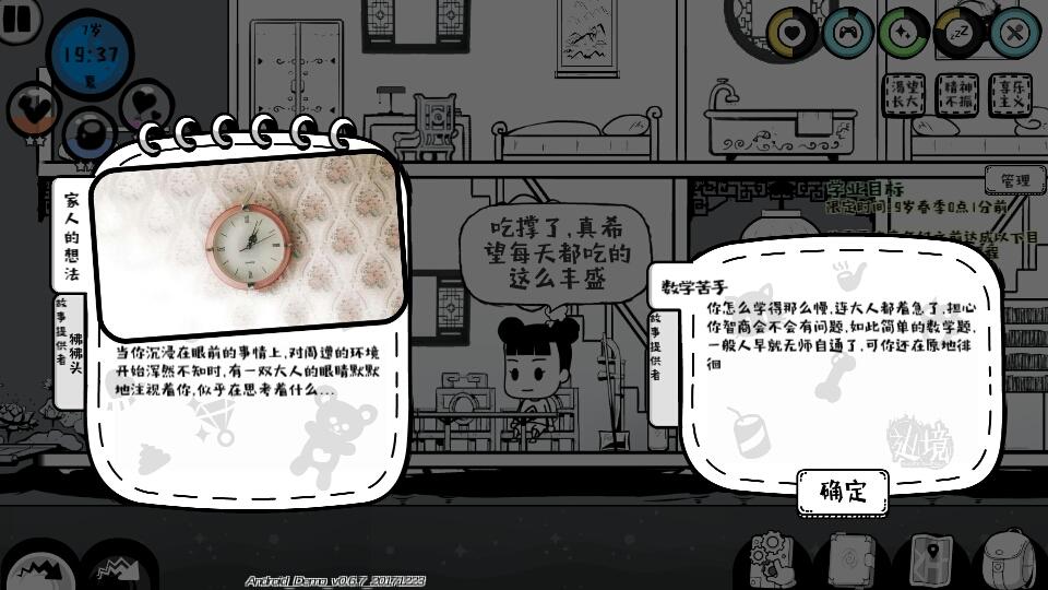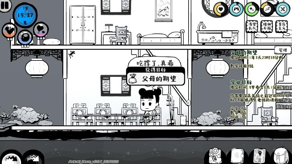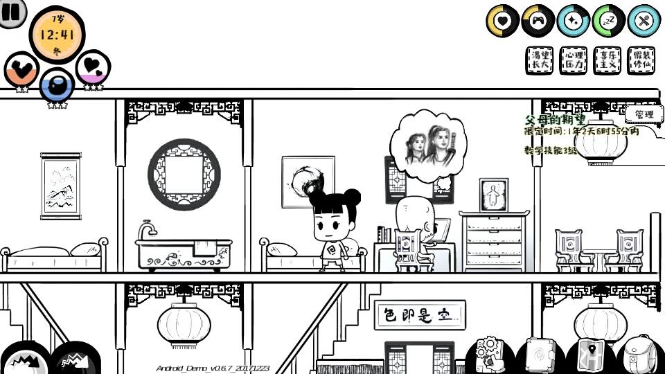 父母到也是恨铁不成钢,第一次期望我音乐三级(与特长生要求一样),本来我的主角是没有什么音乐资质的,我连着小学不上课忘交一次作业,挨打挨骂地在约定时间前达到了音乐三级(获得50块奖励,家庭关系略增加。不过此时身为7岁的主角已经一身疲倦一身病了,并搞出了一行负面buff:厌食 假装修仙 精神不振 心理压力 略有不适等等。)