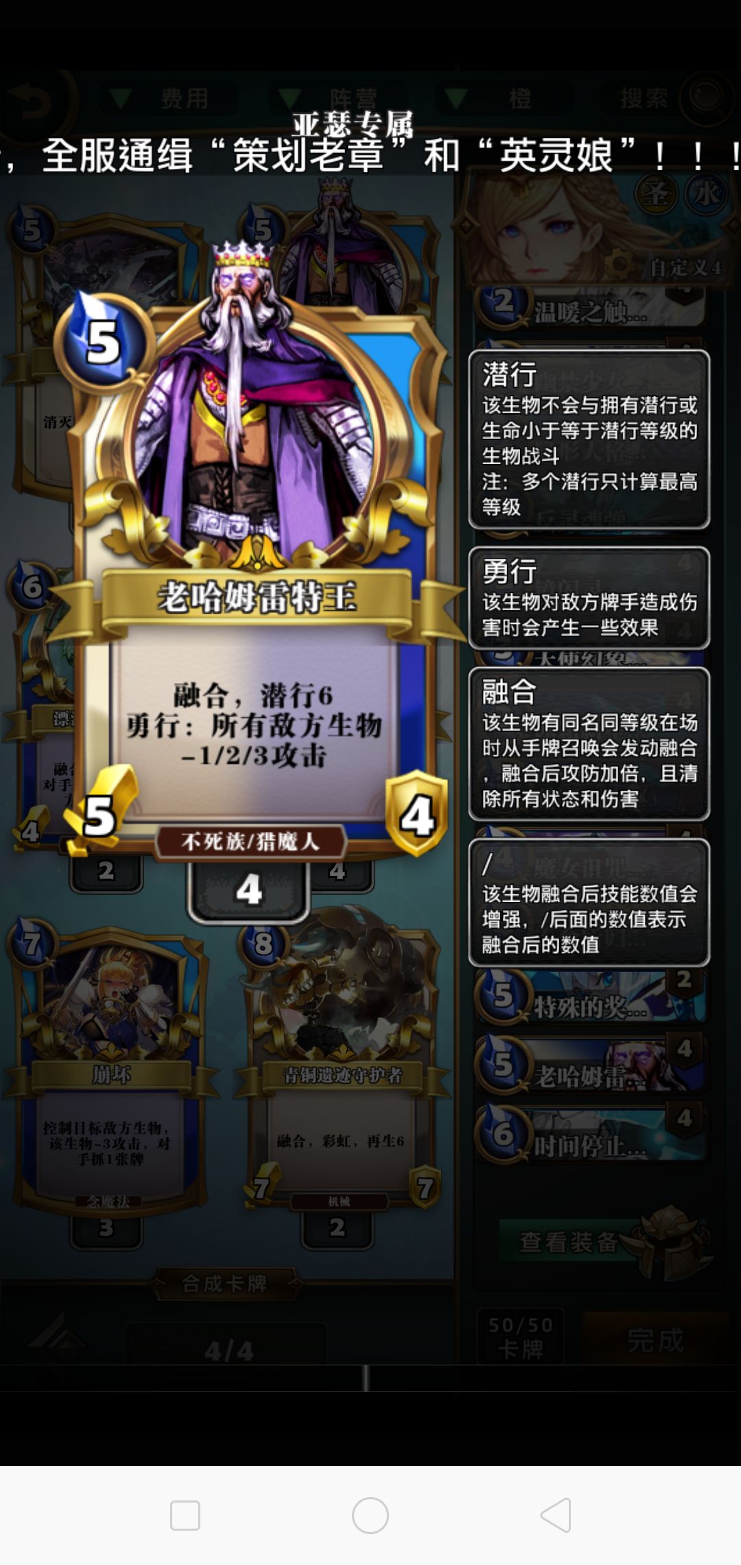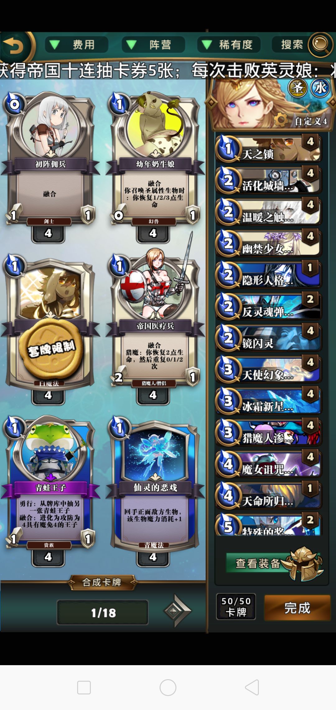 首先,这套牌怎么赢?当对面六个格子占满生物的时候你就赢了一大半了。前期过过牌回回血。解场是不可能解场的这辈子都不可能解场的。然后中期对面下怪要么用墙挡挡要么变青蛙。天之锁慎用。然后你会发现对面战满了,这时候就到我们得核心出场了