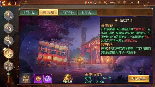 参加宗门祈福的玩家还可参与答题小游戏,答对题目数前3的宗门可获得丰厚的绑玉红包。开服14天后,宗门祈福会解锁跨服答题功能,本服玩家可以和其他服务器的玩家一较高下!